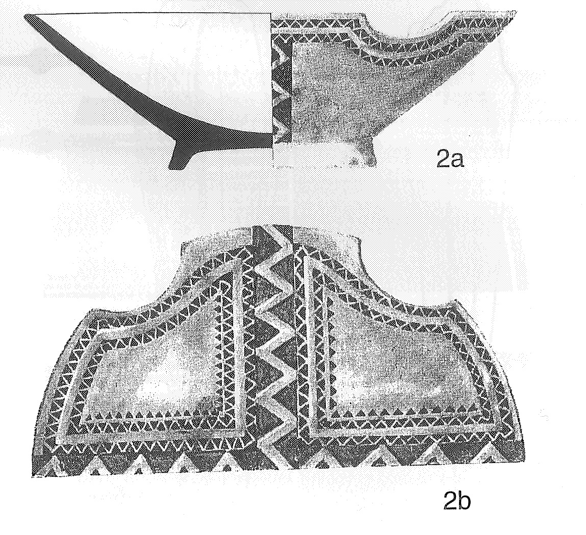 Sledeći fragment (T. III, 2b) takođe pripada tipu duboke šolje, ali sudeći prema ostatku ornamenta koji se sastoji od geometrijske figure, romba ili kvadrata, na slobodnom fonu između drški, kao i po nešto široj horizontalnoj traci firnisa ispod oboda, ona bi se mogla uvrstiti u grupu »šolja sa rozetom«, datiranih u isto vreme kao šolje grupe A.12 I ovaj fragment je veoma fine fakture, crvenkaste boje gline, sa svetložutom angobom spolja i iznutra, a firnis je tamnomrke boje.